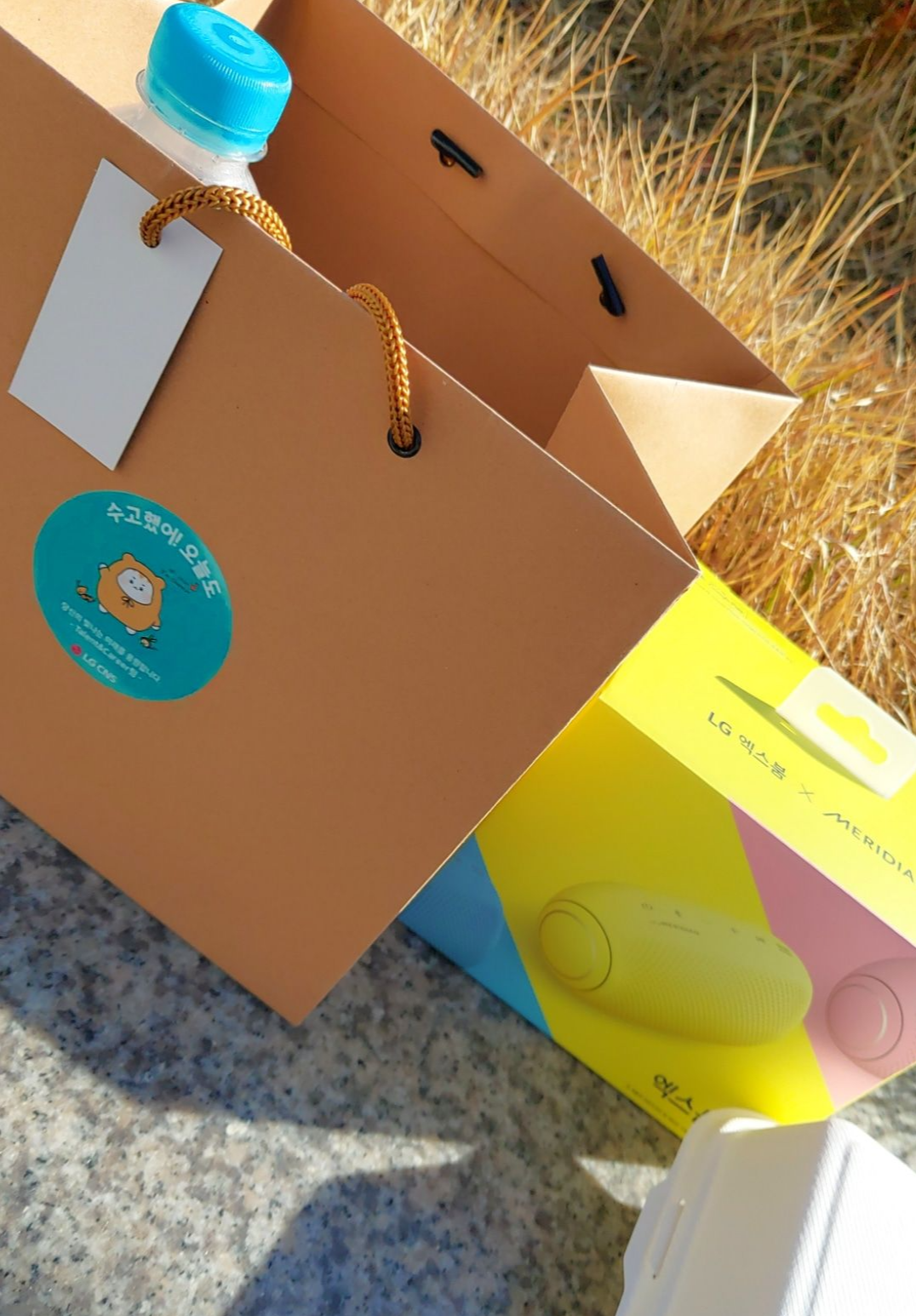 본선에 참가한 사람들에게 주는 상품입니다. 오른쪽 아래 흰 박스가 한 입 요리들이 들어간 박스이고, LG 블루투스 스피커도 줬습니다. (감동...)