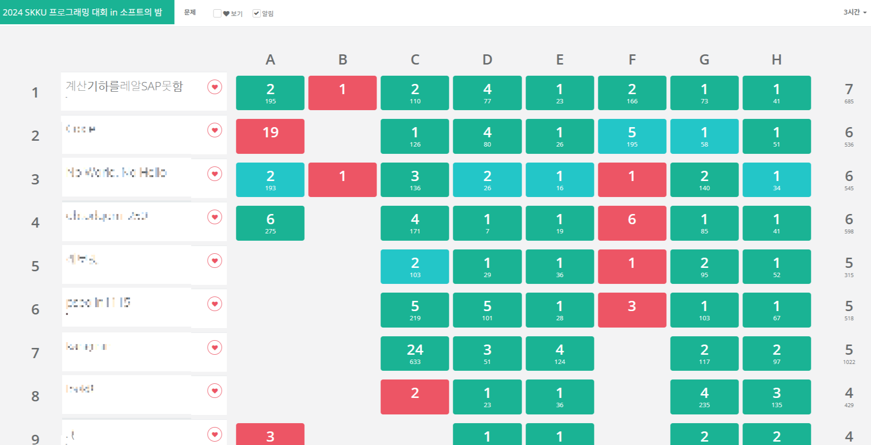 이번 대회는 특이하게도 문제 난이도 순서가 랜덤이고, 또 이름 달지말고 별명으로 만들어달라고 해서 5분 생각해서 나온 별명 계산기하를레알SAP못함 은 1년 넘게 인턴 하고 있는 회사이름을 넣었고, 기하학 문제에 약해서 이렇게 지었다 (SCPC 1차 예선 CHT문제를 제곱근분할으로 푼 사람 나야..).